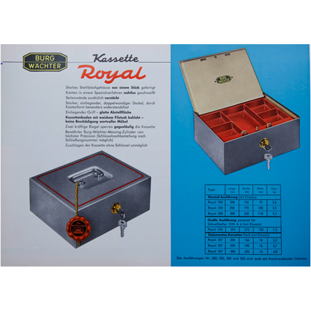 Mais malgré toute la nouveauté des années 60, les images publicitaires colorées pour les serrures en laiton et le nouveau siège de la serrure à Meinerzhagen-Valbert, il y a des moments sombres. Alfred meurt en 1960, puis Alfred Junior en 1964, à l'âge de 39 ans. On se souvient toujours que certains trésors peuvent être protégés, mais que la vie en soi est entre d'autres mains. - Les "petites" valeurs, les biens, peuvent être enfermés et verrouillés. - Les grandes valeurs, l'ici et maintenant et ce qui est à venir, l'éternel, la vie en soi, doivent être vécues. Ce qui est le plus précieux reste gratuit - et en même temps inestimable.