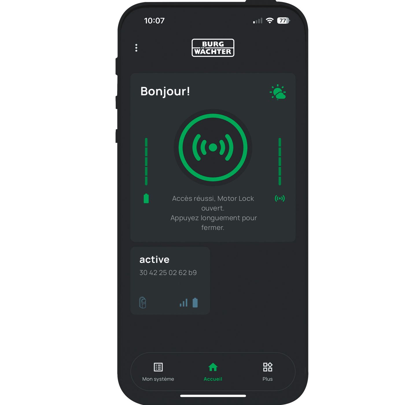En plus de la configuration et de la gestion de l'ENTRY ACTIVE, l'application BURGsmart permet également d'intégrer d'autres utilisateurs, y compris leurs smartphones, et de contrôler plusieurs appareils BURG-WÄCHTER, le tout depuis votre smartphone. Disponible gratuitement dans l'Apple App Store et le Google Play Store.