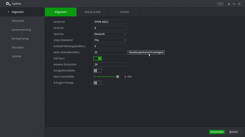 Hinweis: Aus Sicherheitsgründen ist eine permanente Livebildanzeige nur am lokalen Monitor möglich. Möchten Sie eine permanente Livebildanzeige am PC sehen, so nutzen Sie bitte die BURGvms.
