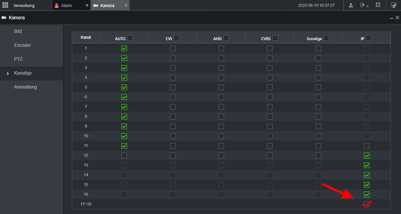 Sie finden die Einstellung unter Verwaltung > Kamera > Kanaltyp > Wählen Sie hier den untersten Punkt rechts, in der letzten Zeile. (Abb. zeigt die Webseite des Rekorders, lokale Anzeige kann abweichen)